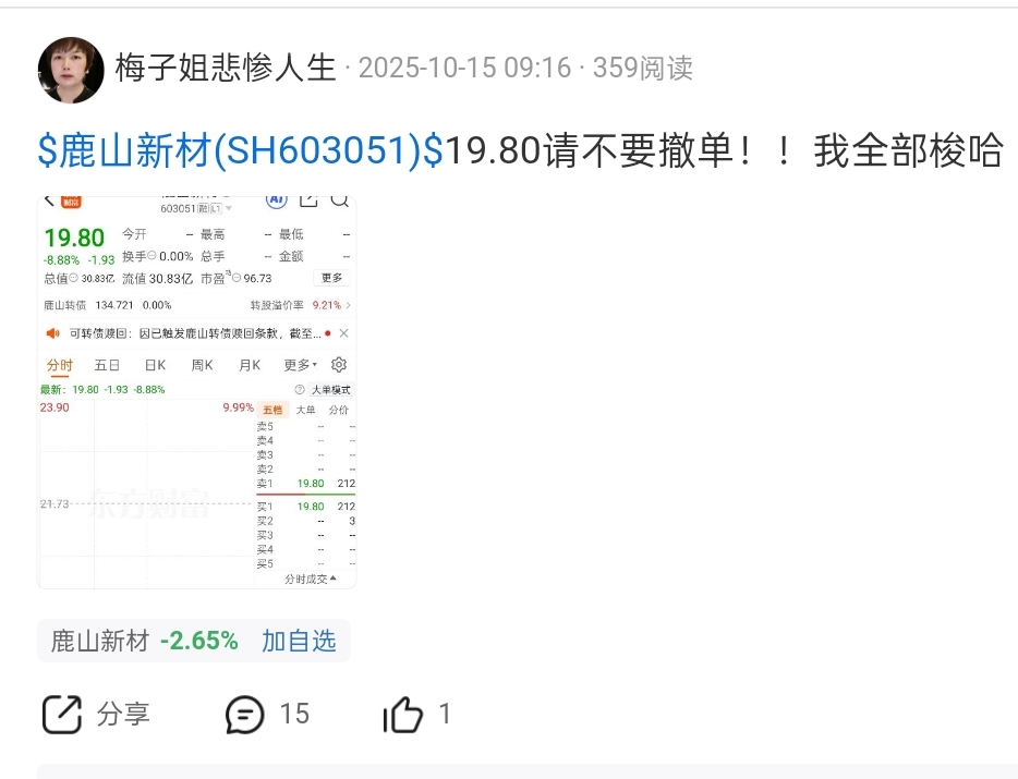 $鹿山新材(SH603051)$ 为什么不跌停?有种跌停!啊,,1440天 - 今日 = 1439天,看谁耗过谁!