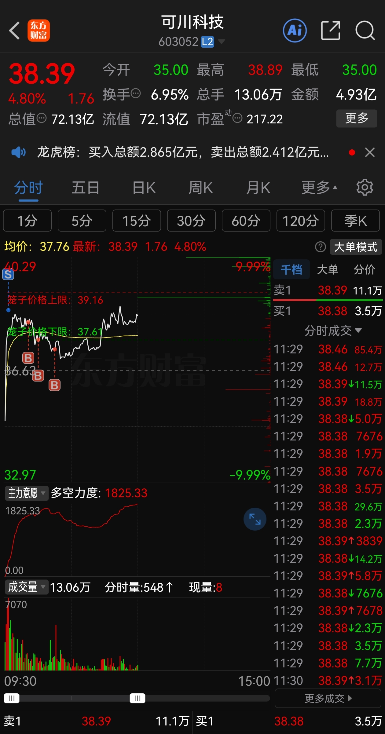 $可川科技(SH603052)$ 不怕今天最高清仓赚大米,发现不对又买了点回来,主力净流入,放量突破新高,不怕!
