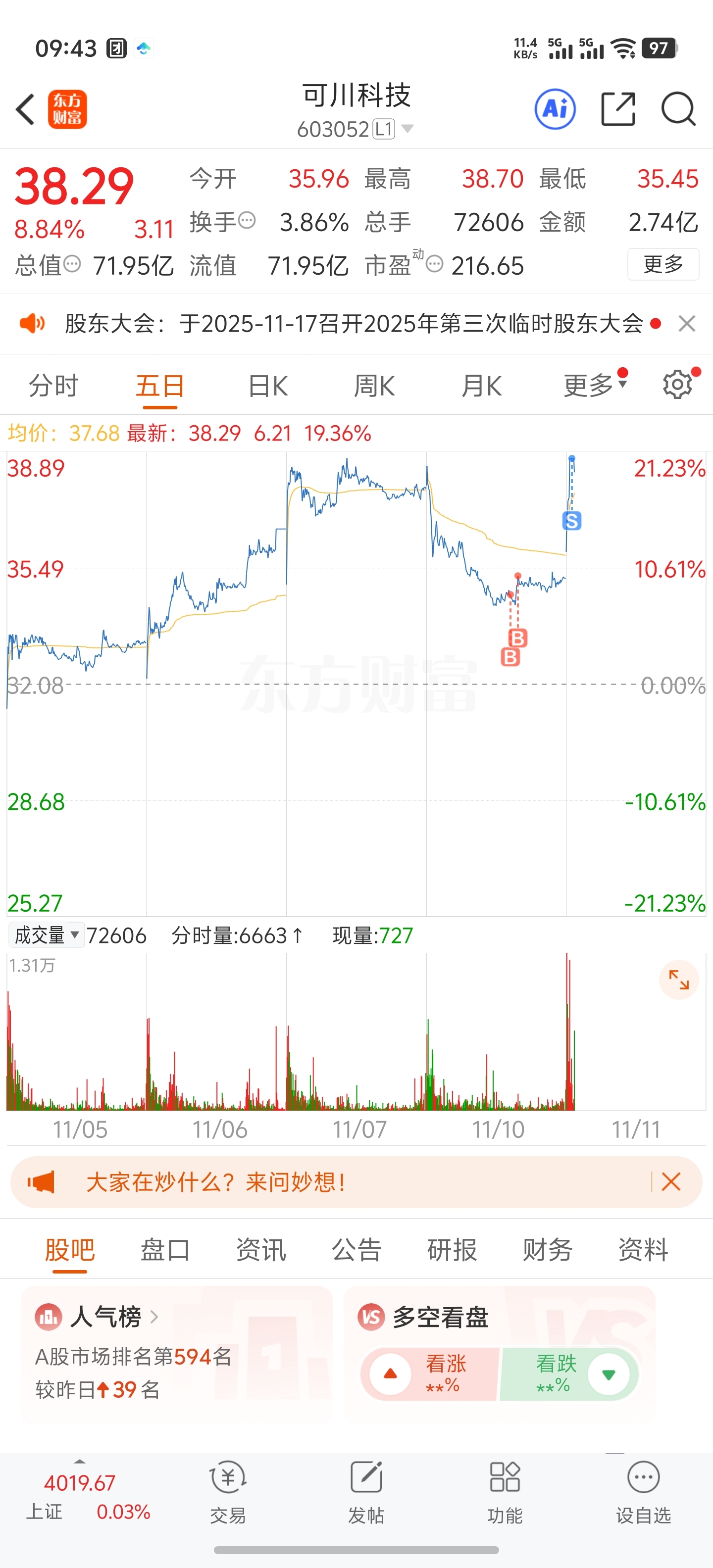 $可川科技(SH603052)$ 走了走了,感谢主力