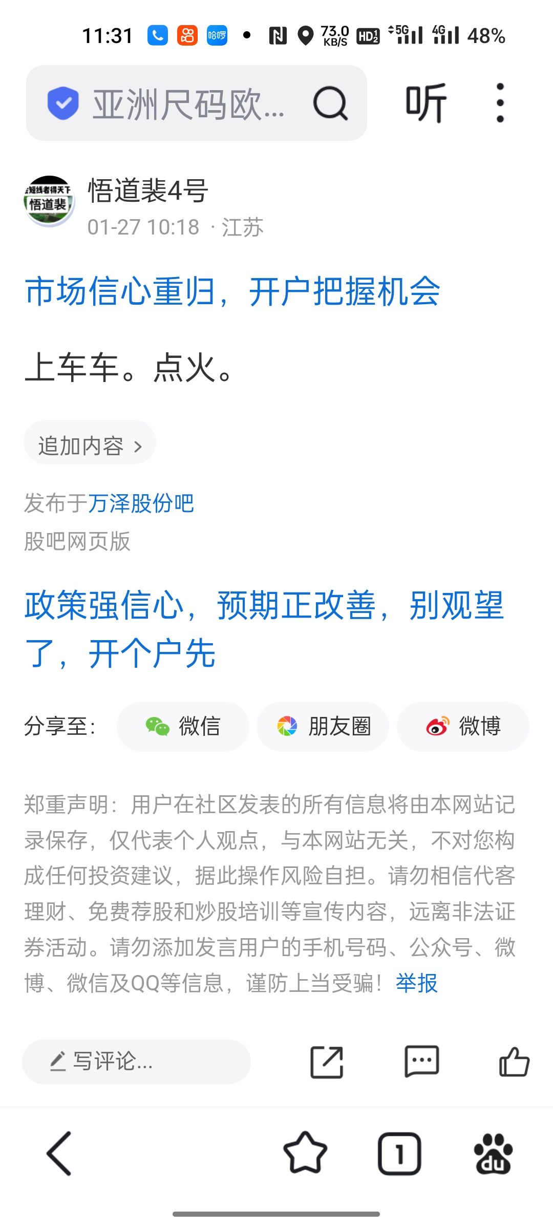 温馨提示: 1.根据《证券法》规定,禁止编造、传播虚假信息或者误导性信息,扰乱证券市场;2.用户在本社区发表的所有资料、言论等仅代表个人观点,与本网站立场无关,不对您构成任何投资建议。用户应基于自己的独立判断,自行决定证券投资并承担相应风险。《东方财富社区管理规定》