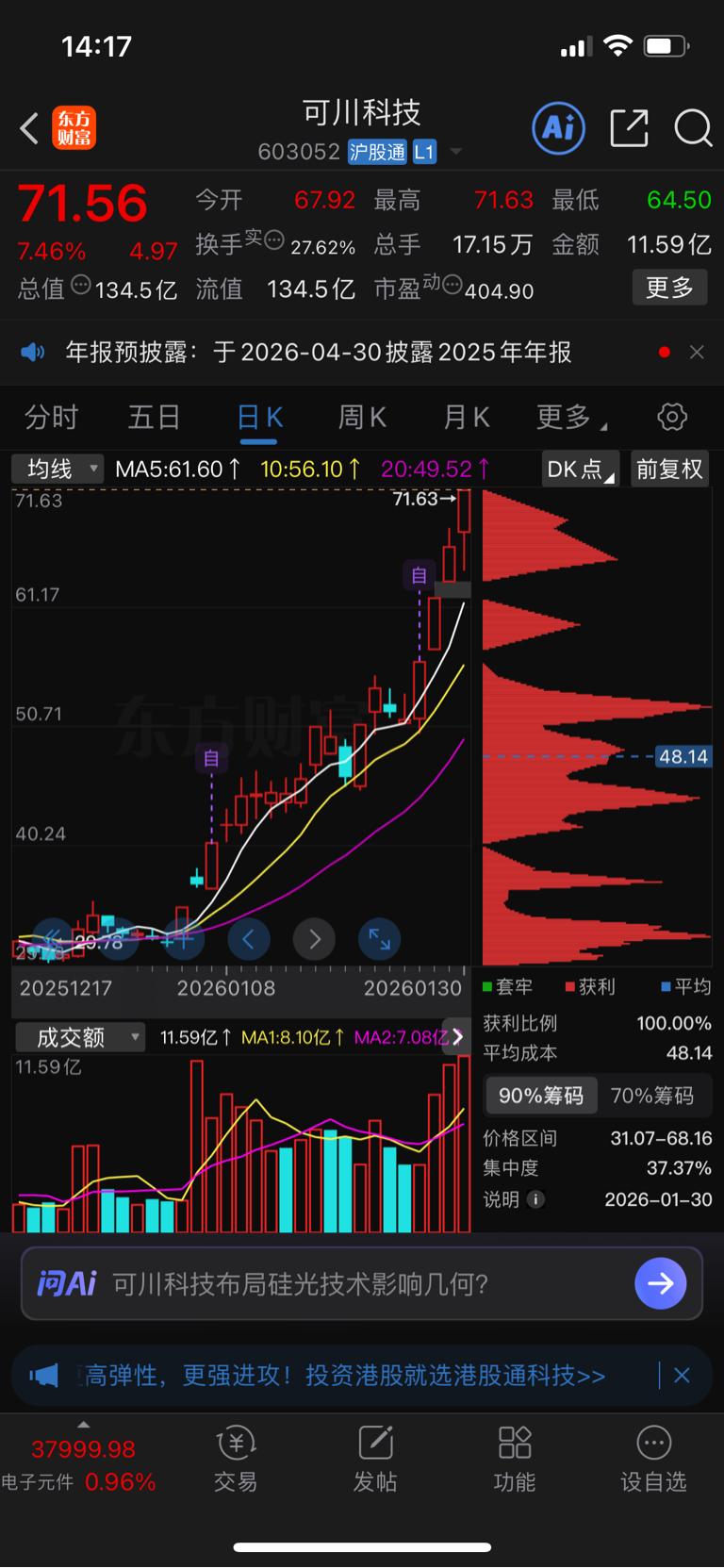 $可川科技(SH603052)$ 等着回调一直没给机会
