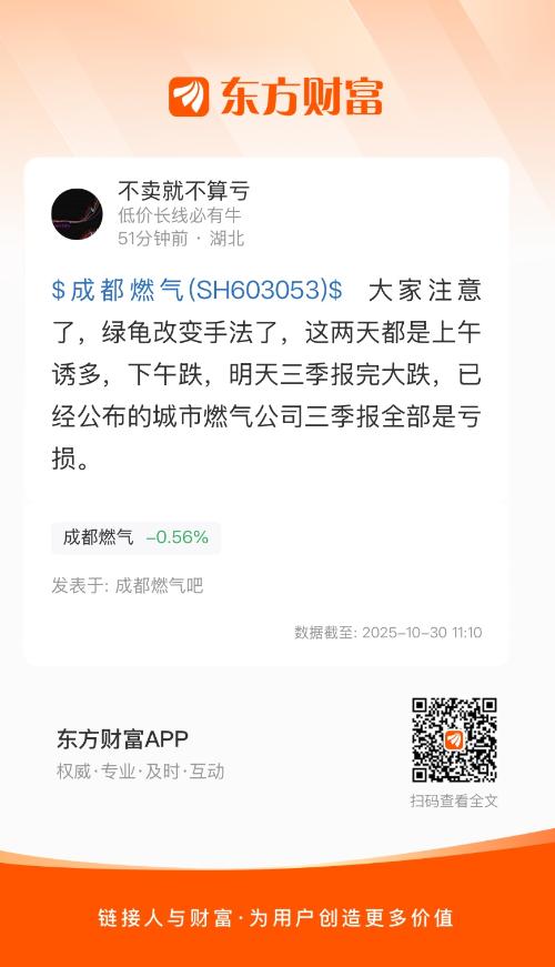 $成都燃气(SH603053)$ 大家注意了,绿龟改变手法了,这两天都是上午诱多,下午跌,明天三季报完大跌,已经公布的城市燃气公司三季报全部是亏损。