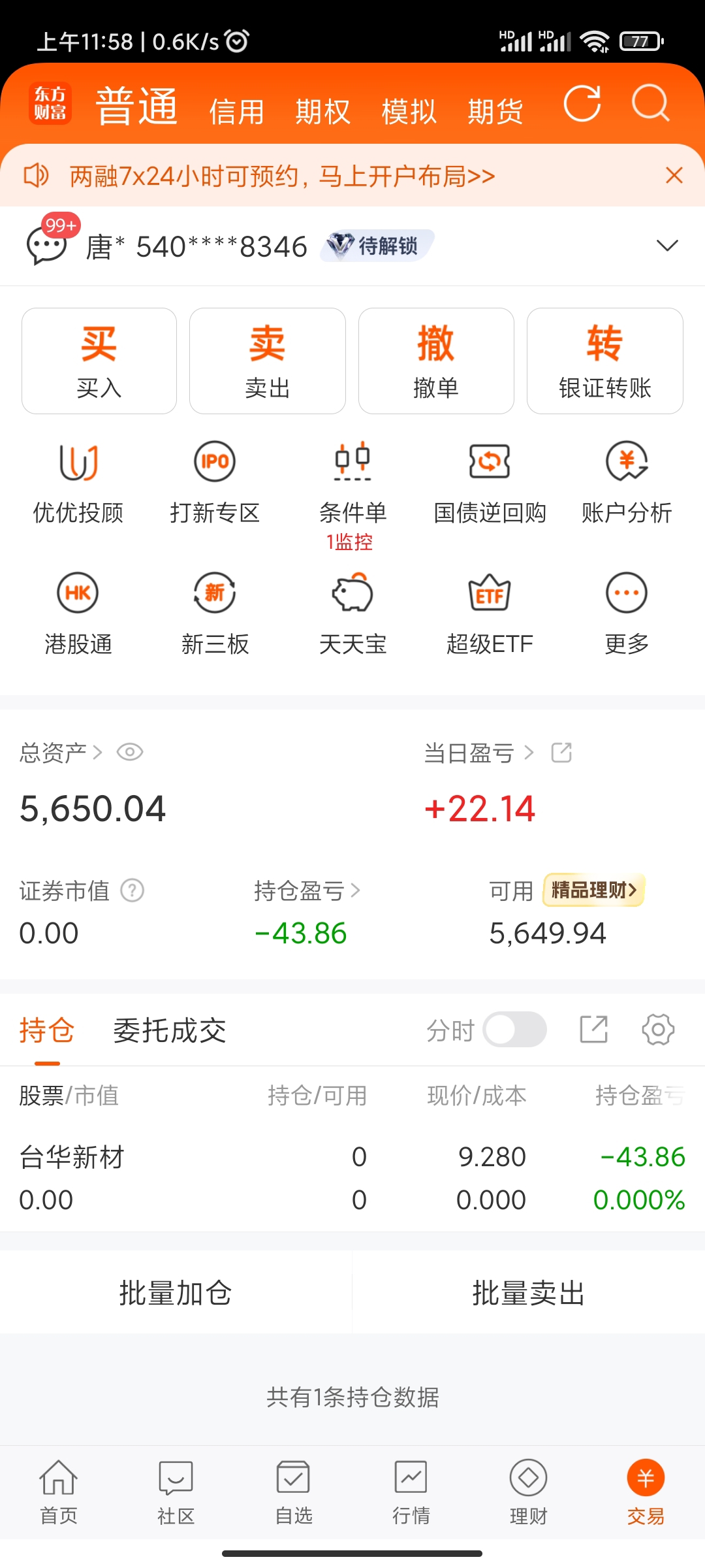 $台华新材(SH603055)$ 大盘不好。本来空仓了几年。至从你前几天大涨我就忍不住了。结果买进来就一直跌。今天我有空仓了。看你怎么跌