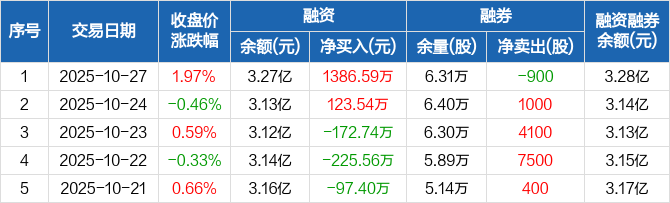 德邦股份:融资净买入1386.59万元,融资余额3.27亿元(10-27)