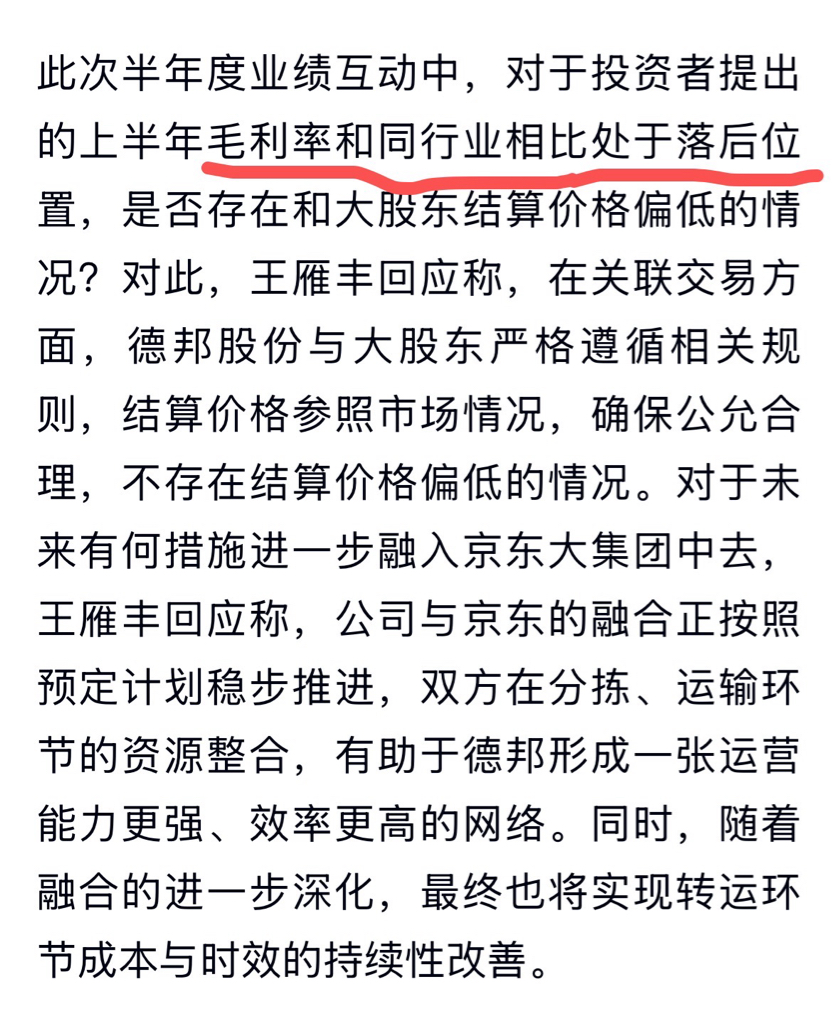 首先德邦亏损以及上半年业绩不佳时候,证劵分析师就公开发表研报质疑德邦京东结算价格低,半年度业绩会交流投资者也当众质疑德邦京东物流结算价格低。现在三季度亏损大幅扩大,大家质疑德邦京东关联交易价格低或利益输送,这不是一件很正常的事?