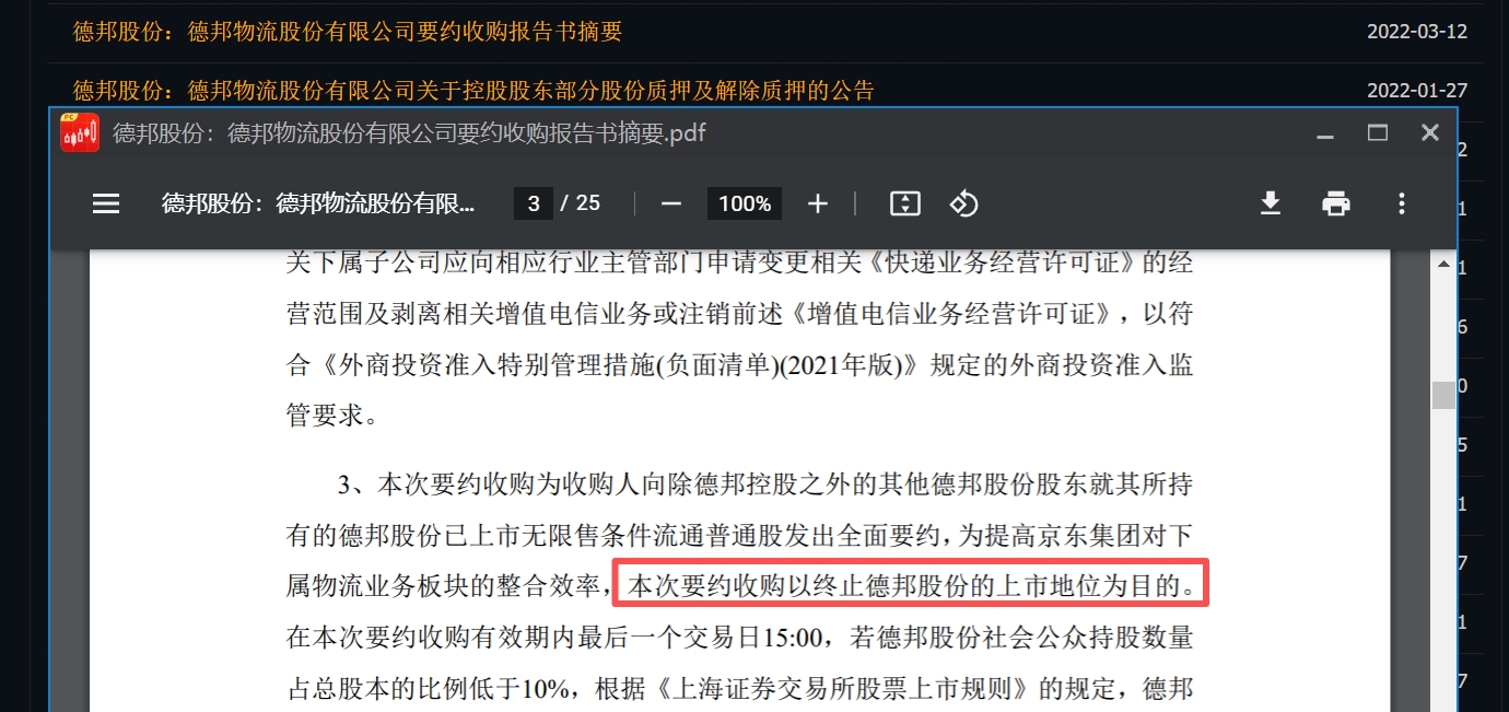 看了下2022年3月12日收购报告书,明确提到“本次要约收购以终止德邦股份的上市