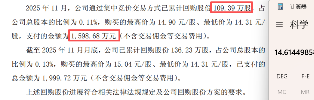 11月回购了1600万,每股均价14.61。累计回购2000万,每股均价14.6