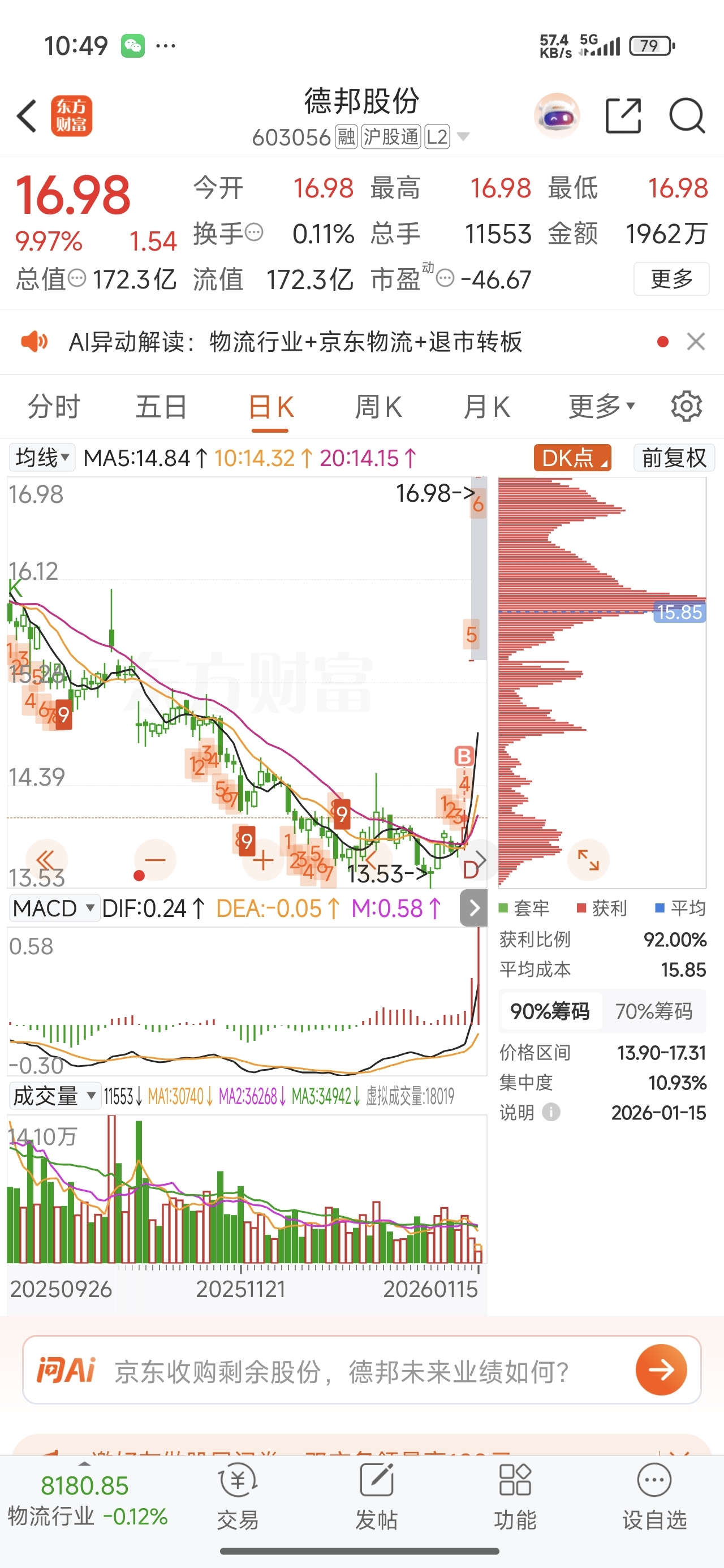 $德邦股份(SH603056)$ 买到了,就是不知道什么时候卖好呢?