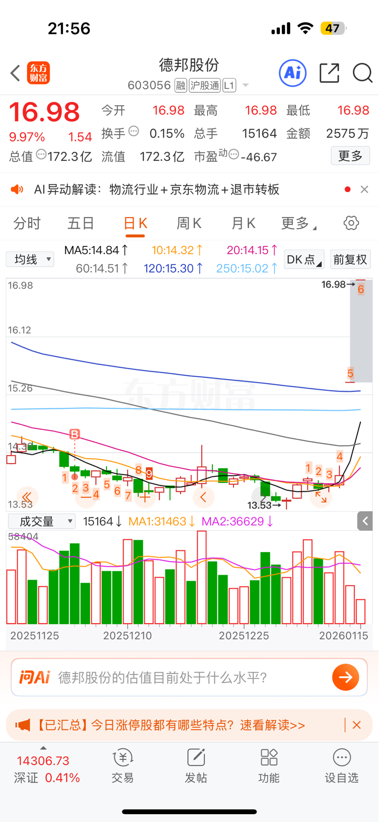 $德邦股份(SH603056)$ 看好的就赶紧挂涨停买入,说多无益。明天绝对会放量,而且量不少。来接我的吧。那些有几百个w的富哥