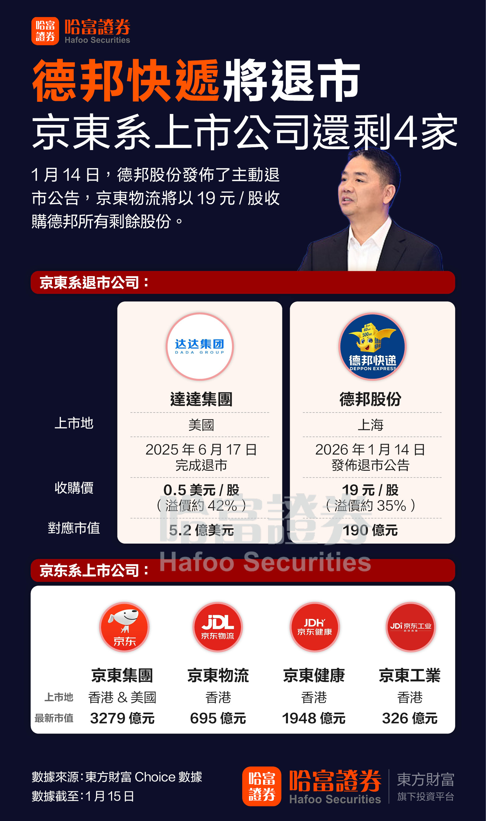 事实上,不只是德邦股份,从去年至今,京东的资本动作还涉及达达集团和京东工业。去年6月17日晚间,本地即时零售与配送平台达达集团宣布私有化交易完成。根据此前4月1日签署的协议,达达与JD Sunflower Merger Sub Limited合并,成为母公司JD Sunflower Investment Limited的全资子公司,母公司由京东集团全资持有。此外,去年12月11日,京东工业成功在港交所主板挂牌上市,成为京东旗下第六家上市公司。公开资料显示京东工业是京东集团旗下专注于工业供应链技术与服务业务的子集团,已成为中国领先的工业供应链技术与服务提供商。不过,如果德邦股份成功退市,京东旗下上市公司将只剩下四家,分别为京东集团、京东物流、京东健康和京东工业。