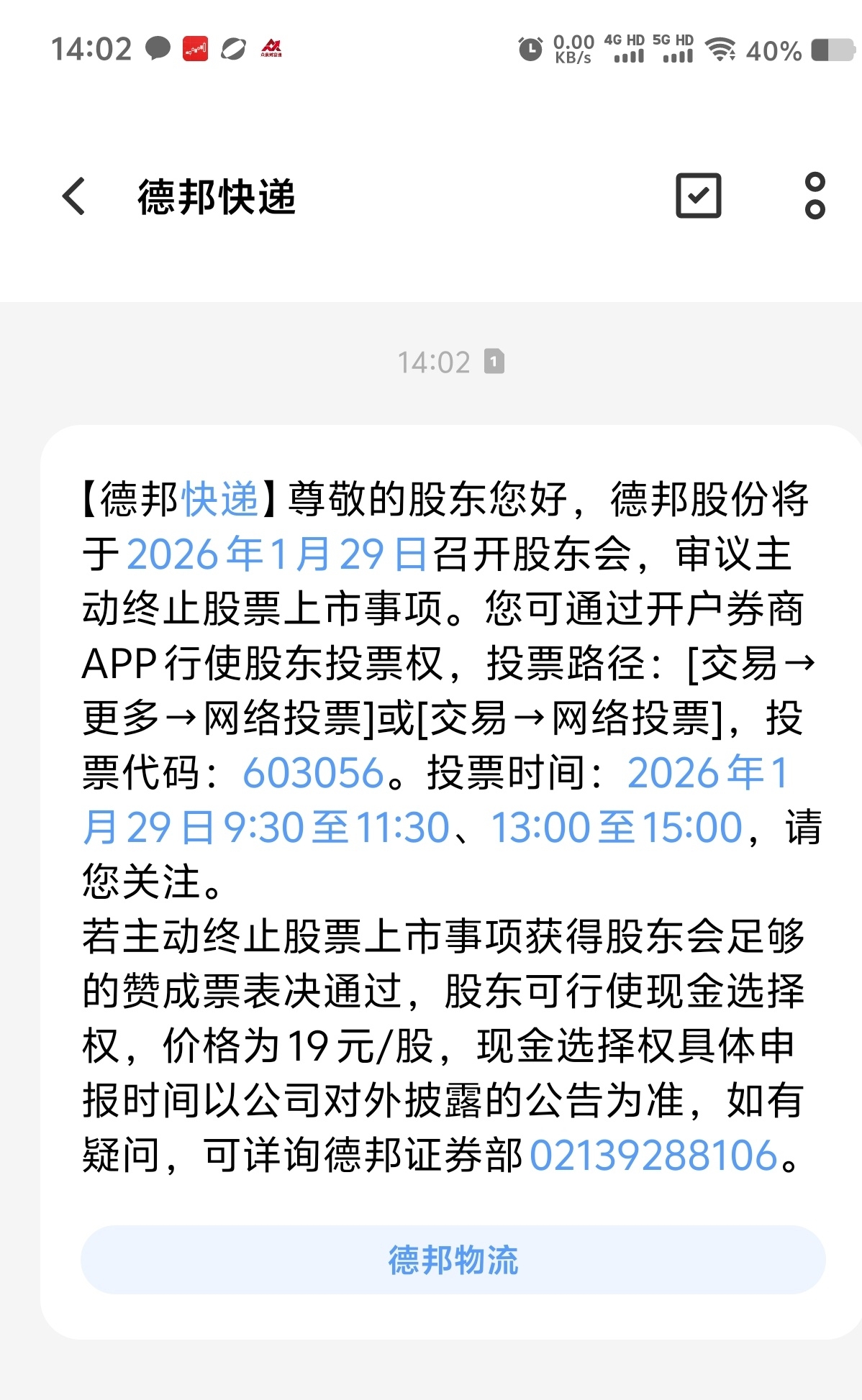 $德邦股份(SH603056)$ 德邦发来贴心短信提醒,别忘了明天投票。大家积极投赞成票!!!