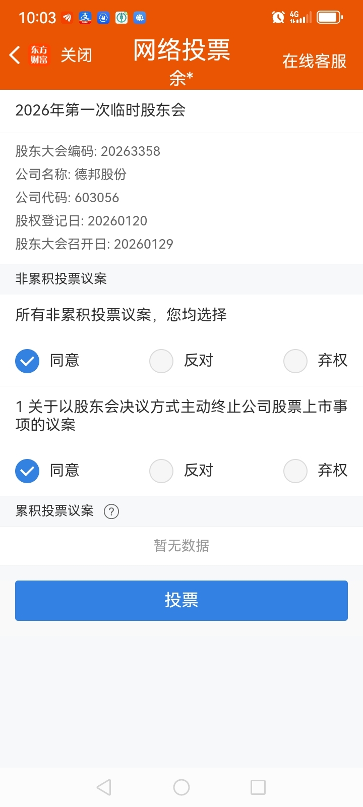 $德邦股份(SH603056)$ 今日股东积极投赞成票,以防万一。