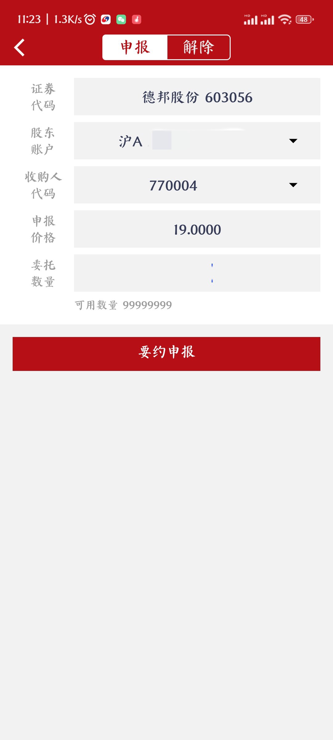 $德邦股份(SH603056)$ 交易-其他交易-要约申报,代码输入603056,自动填入收购人代码,委托数量填持仓量
