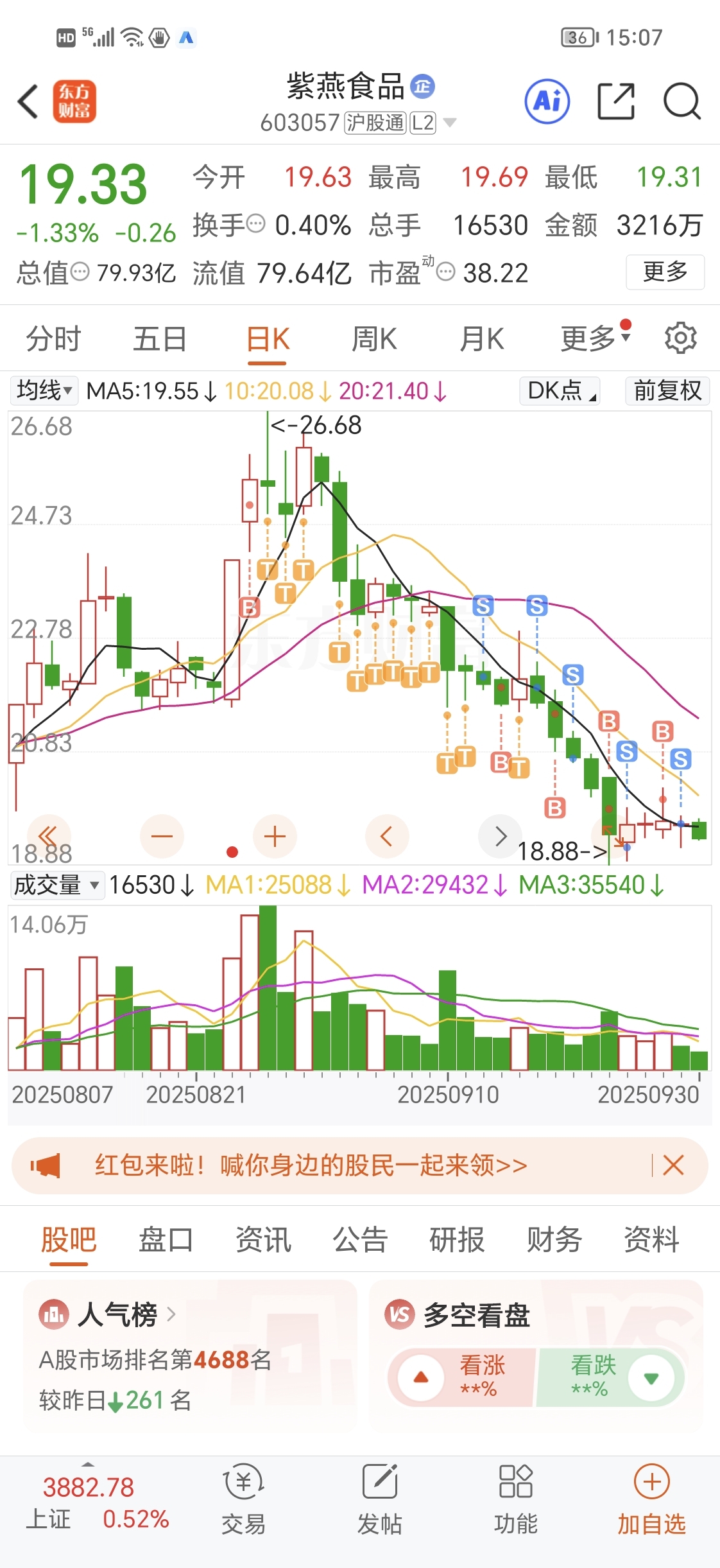$紫燕食品(SH603057)$ 终于割肉清仓了紫燕,10月亏损2万,正好紫燕亏了20000。今天重仓的兄弟KJ又亏。希望假期过后能调整好心态,做短线即使大盘跌也能盈利。格局一个紫燕硬是血亏一个月。8月底刚重仓进来一周就挣了10000多,结果到现在反而亏了2万离场。如果不减仓亏更多。