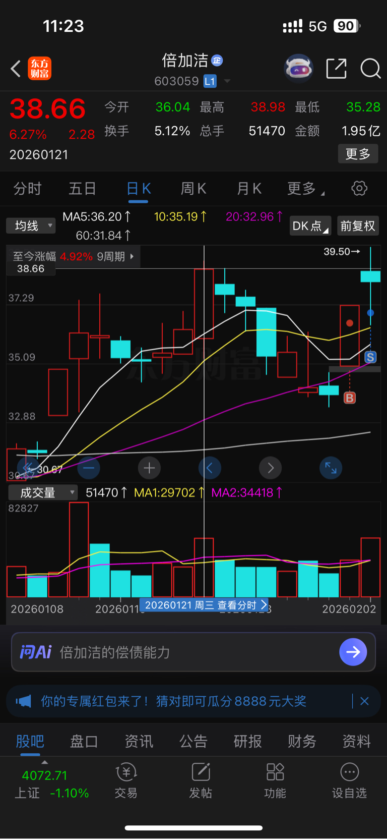 $倍加洁(SH603059)$ 虽说我抓个涨停是很容易,也知道你今天大概率破前高38.98,但你开盘就砸盘,属实有些欠抽,B我挂条件单治你?