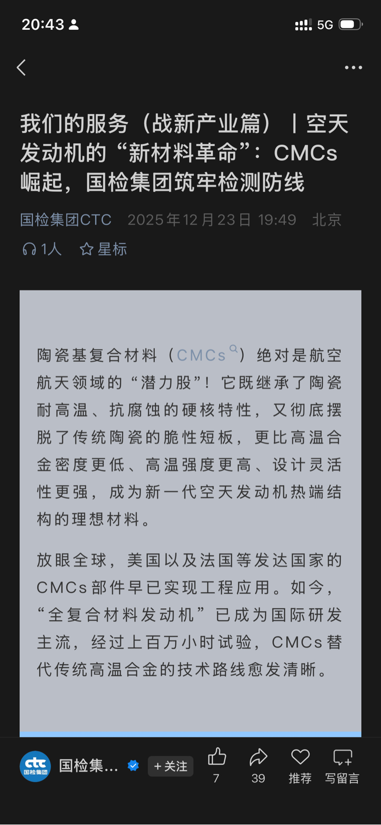 国检集团公众号已经证实了自己是航空材料检测公司,兄弟们千万别卖飞了。肯定能涨一波