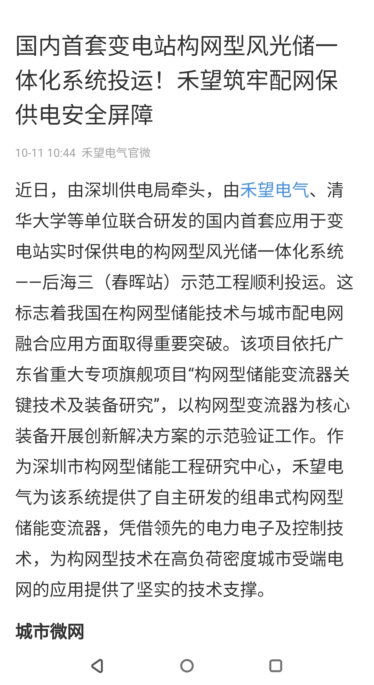 国内首套变电站构网型风光储一体化系统投运———禾望电气