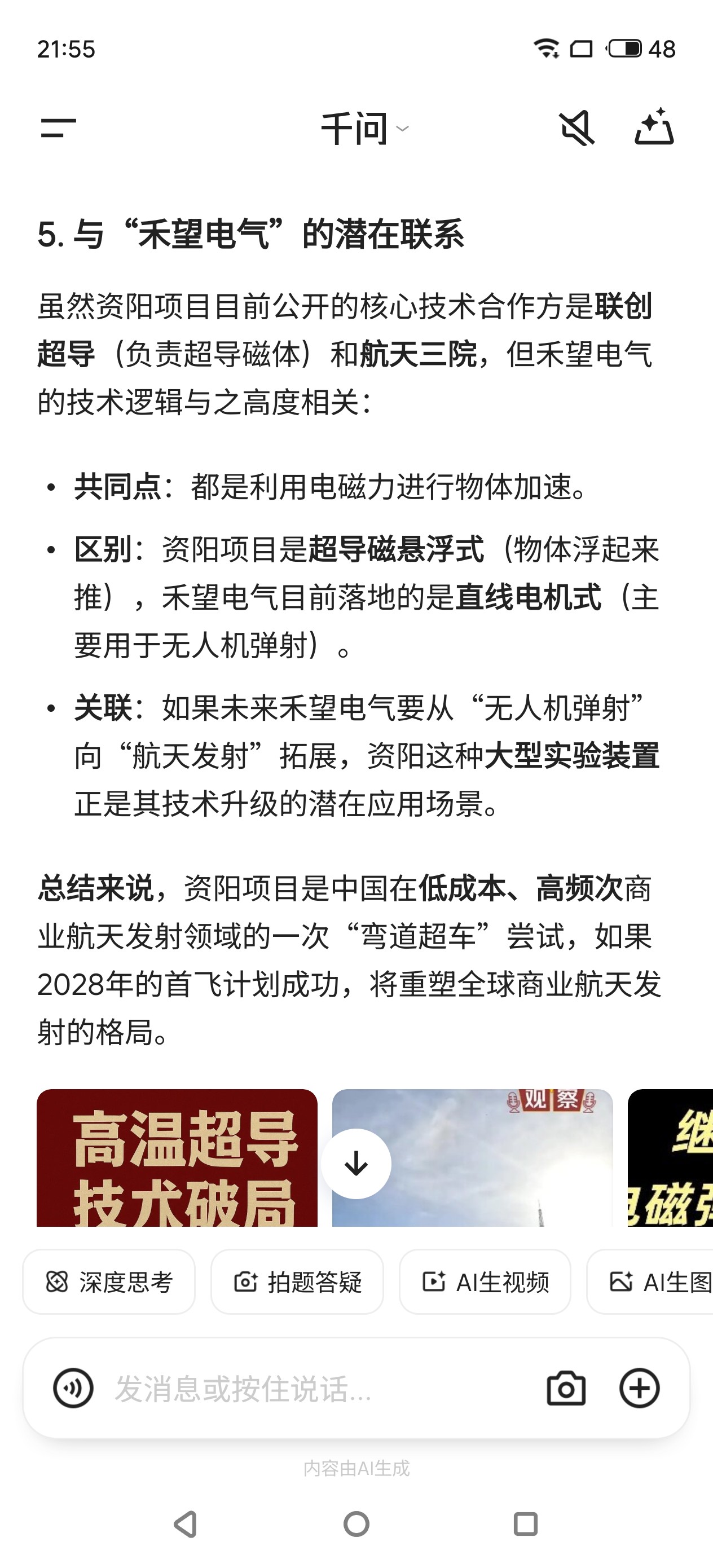 1)航天发射用的电磁弹射技术,正是禾望电气所掌握的“磁悬浮电磁推进技术”的高阶应用形态。虽然目前禾望的主要落地产品是无人机电源,但其研发的“特种电源”和“磁悬浮控制”技术,正是未来用于“电磁发射卫星”或“辅助火箭起飞”的关键技术组件。