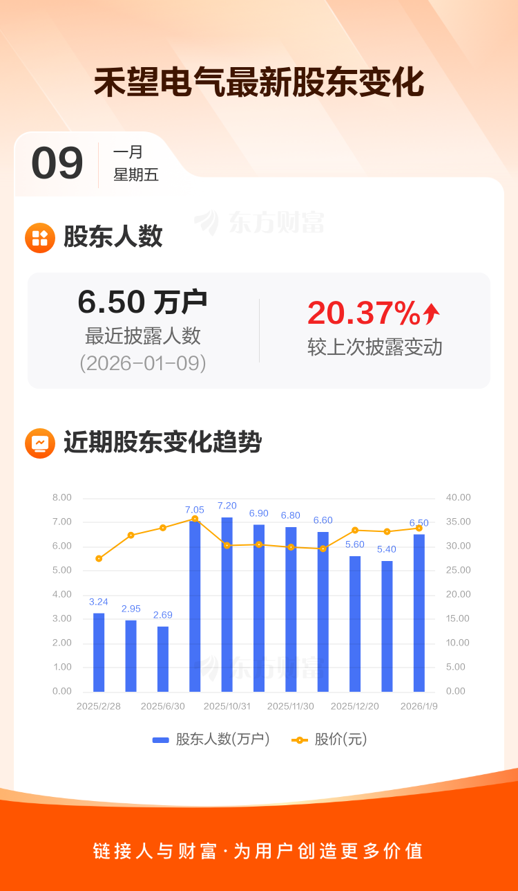 禾望电气:截至1月9日最新股东户数6.50万户,较上期增加20.37%