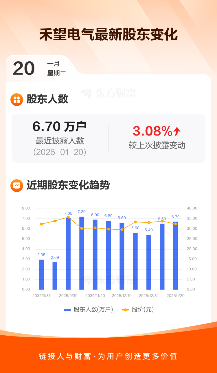 禾望电气:截至1月20日最新股东户数6.70万户,较上期增加3.08%