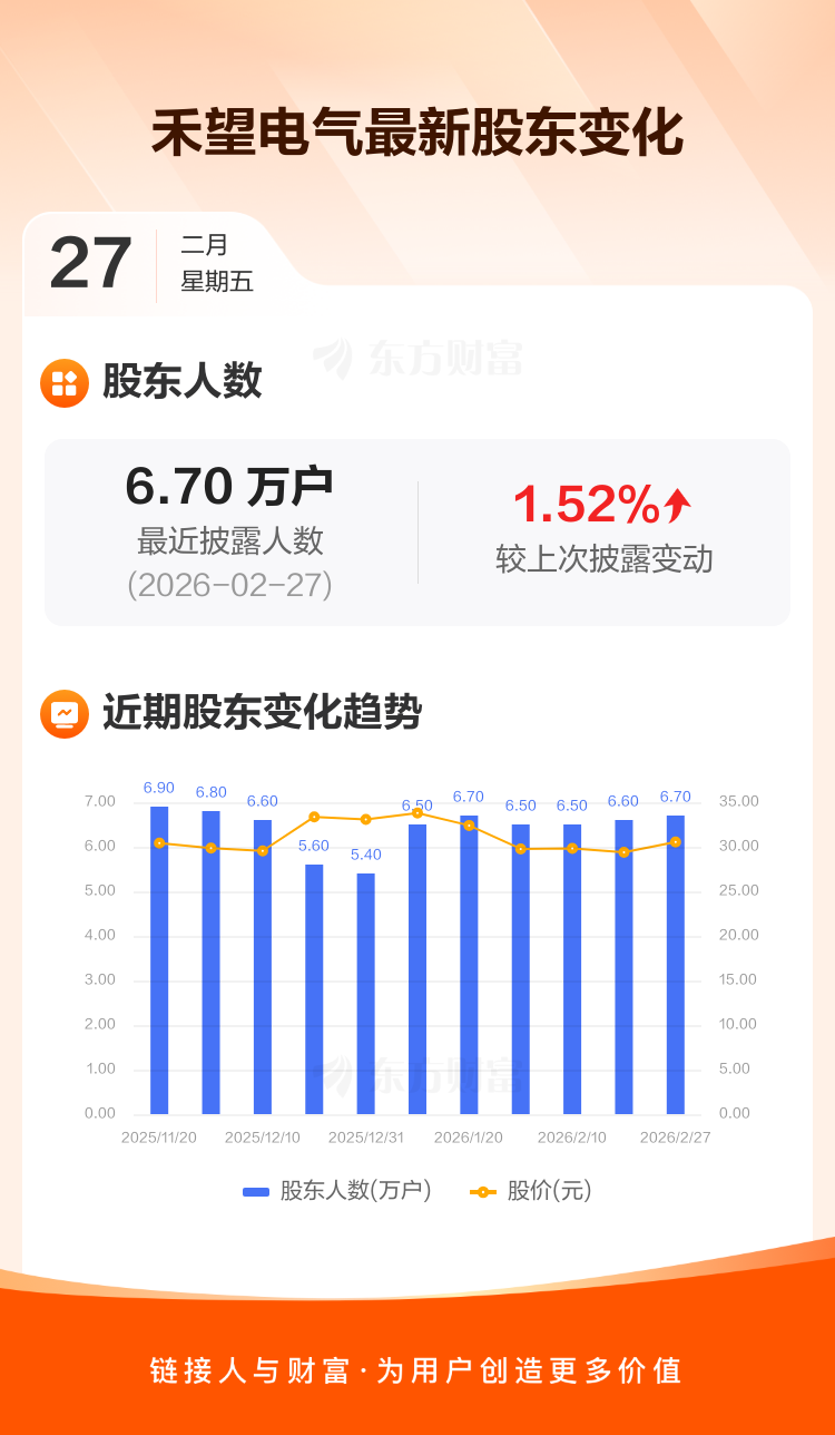 禾望电气:截至2月27日最新股东户数6.70万户,较上期增加1.52%