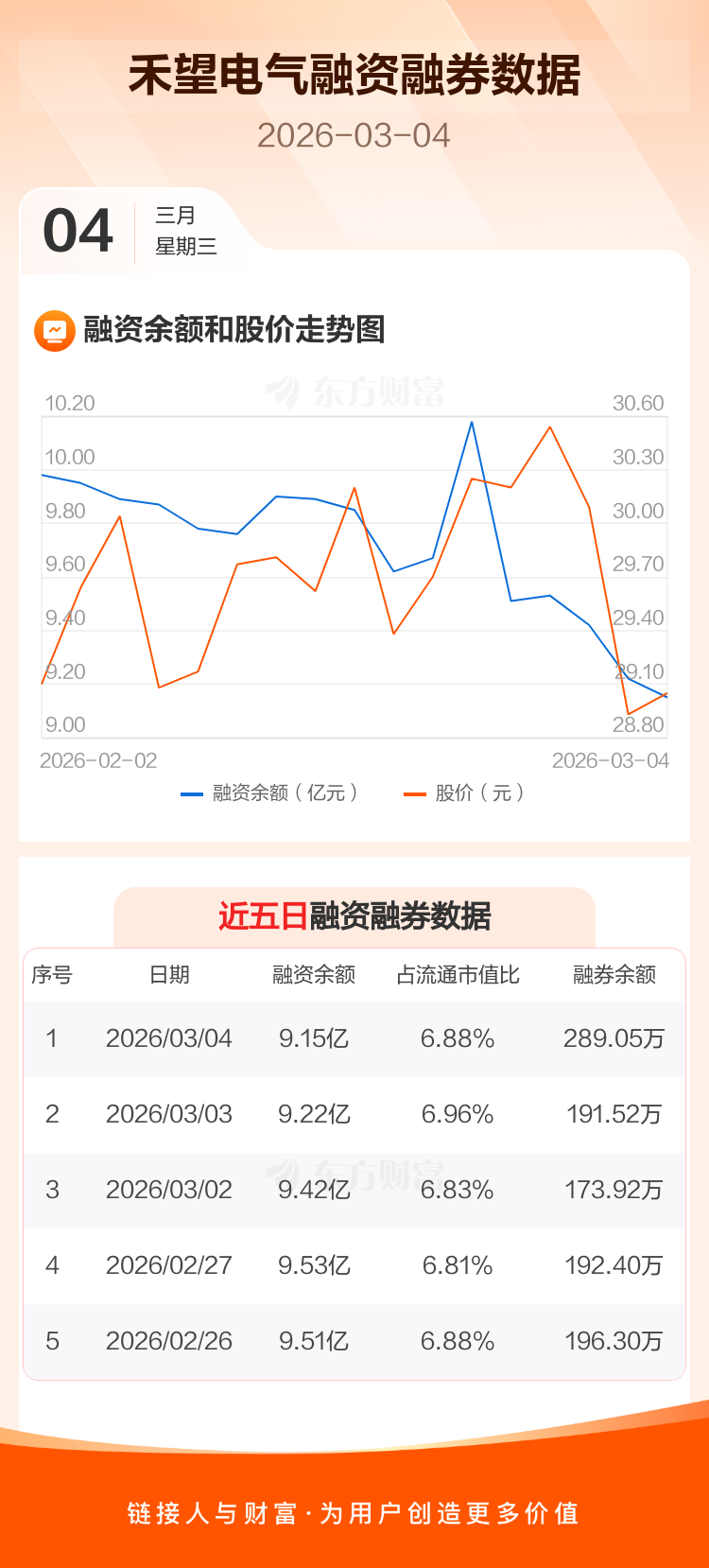 交易所最新数据显示,禾望电气于2026年3月4日获融资买入2570.67万元,融资偿还3288.50万元,当日融资净偿还717.84万元。目前,该股融资余额9.15亿,占流通市值比例为6.88%。
