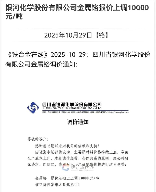 银河化工的金属铬10月底与振华股份一同也已涨了10000元/吨,如下图,振华股份