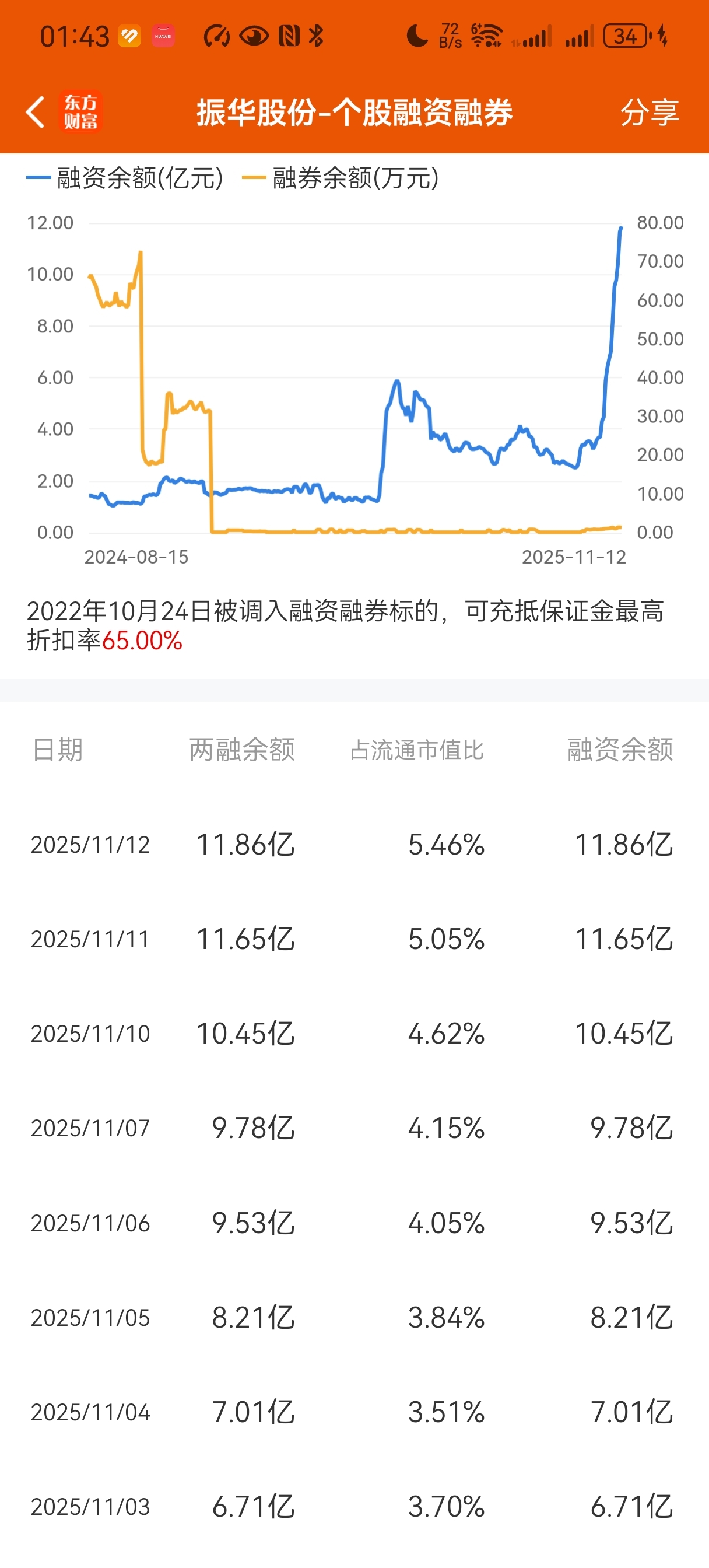 $振华股份(SH603067)$ 为明天的地板再贡献点力量,如图所示,融资余额持续攀升,从2亿多到11亿多,占比超过警戒线5%.