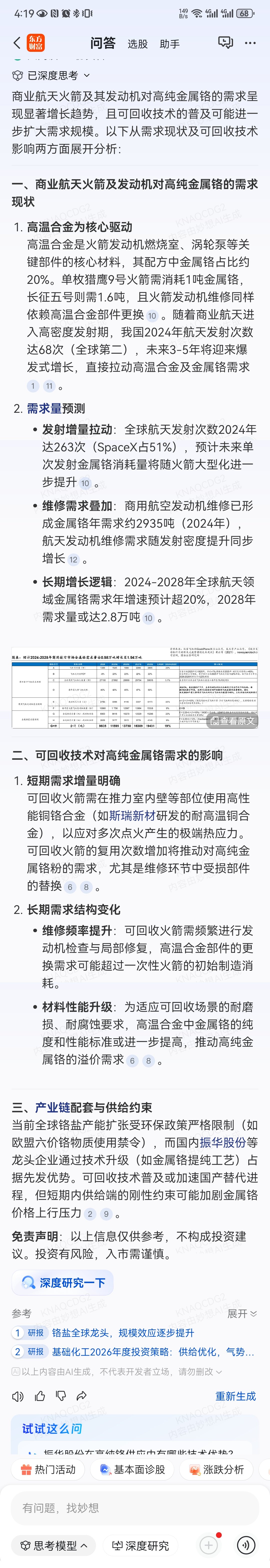 $振华股份(SH603067)$ 商业航天火箭对高纯金属铬需求年增长超过20%,单箭超过1吨,2028年需求约2.8W吨。相对航天板块一些股,能贡献多少受益,还虚无缥缈,振华股份边角料实实在在将受益,聪明资金都不聪明了?