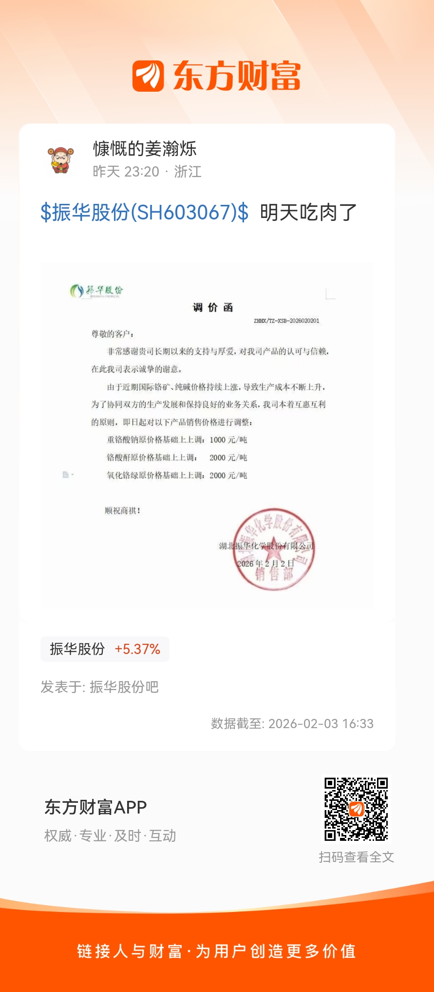 $振华股份(SH603067)$  明天吃肉了