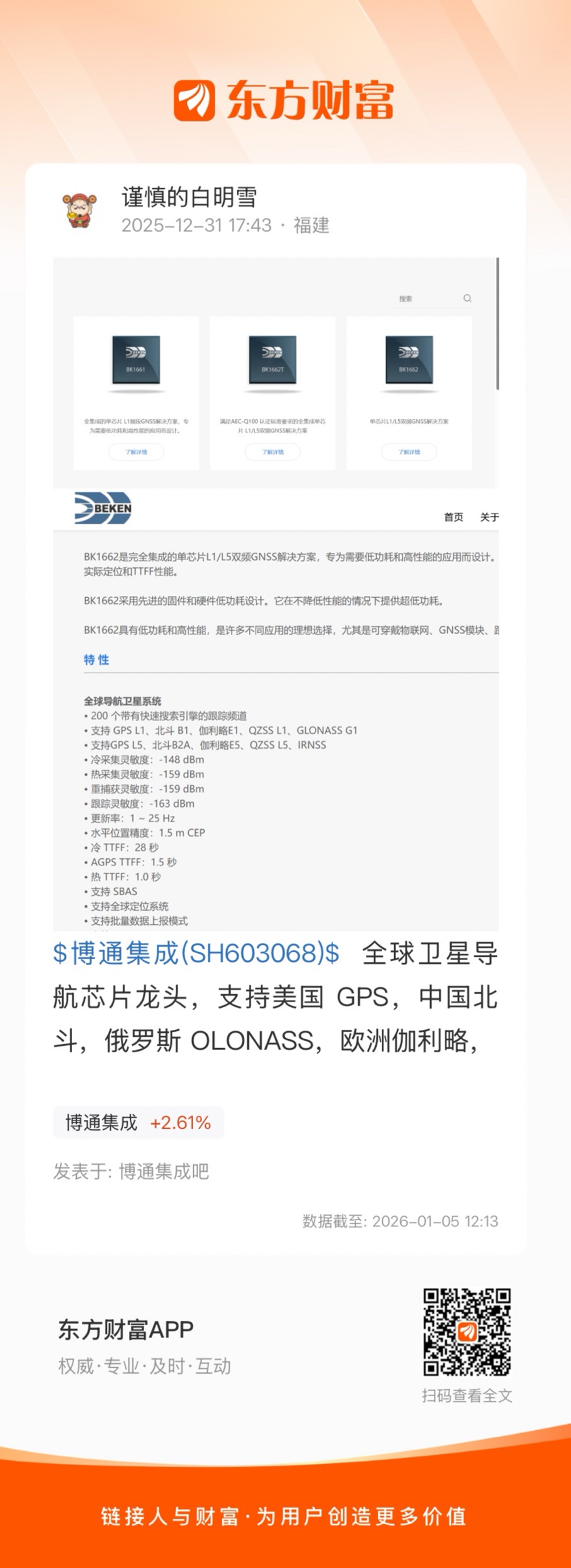 $博通集成(SH603068)$  全球卫星导航芯片龙头,支持美国 GPS,中国北斗,俄罗斯 OLONASS,欧洲伽利略,