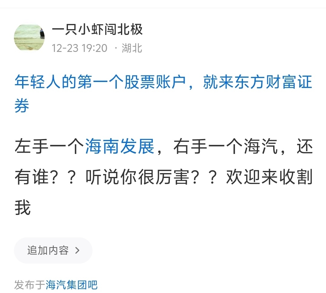 温馨提示: 1.根据《证券法》规定,禁止编造、传播虚假信息或者误导性信息,扰乱证券市场;2.用户在本社区发表的所有资料、言论等仅代表个人观点,与本网站立场无关,不对您构成任何投资建议。用户应基于自己的独立判断,自行决定证券投资并承担相应风险。《东方财富社区管理规定》