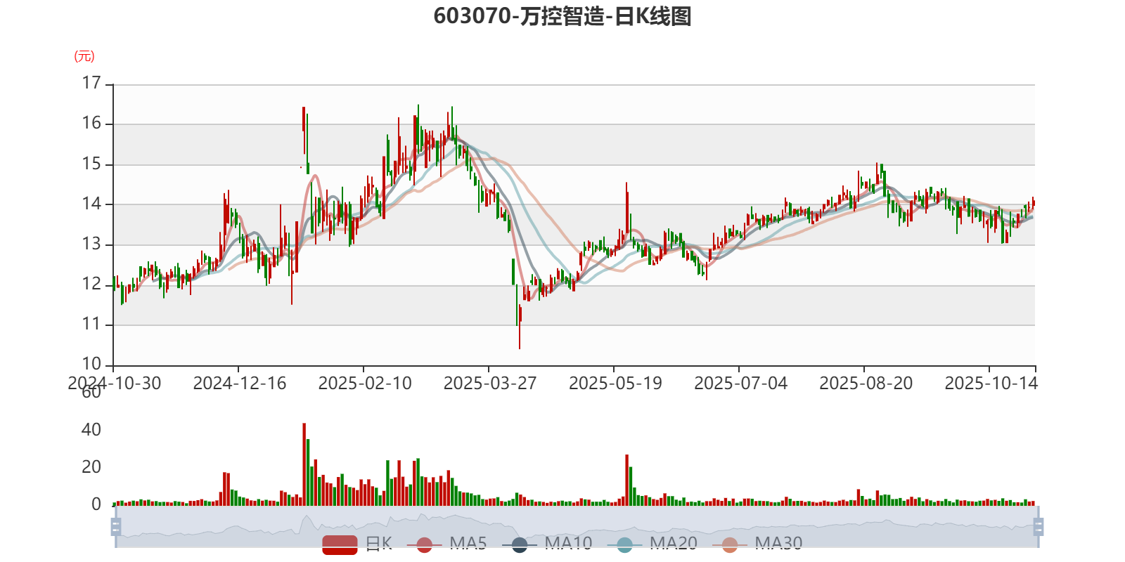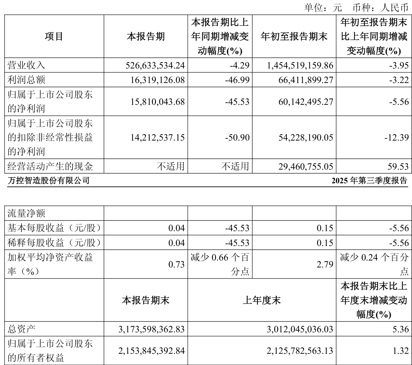 中证智能财讯万控智造(603070)10月30日披露2025年第三季度报告。前三季度公司实现营业总收入14.55亿元,同比下降3.95%;归母净利润6014.25万元,同比下降5.56%;扣非净利润5422.82万元,同比下降12.39%;经营活动产生的现金流量净额为2946.08万元,同比增长59.53%;报告期内,万控智造基本每股收益为0.15元,加权平均净资产收益率为2.79%。