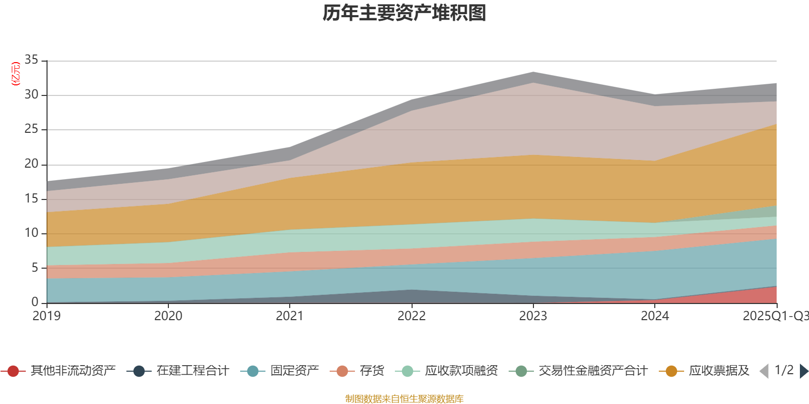 资产重大变化方面,截至2025年三季度末,公司货币资金较上年末减少58.8%,占公司总资产比重下降15.97个百分点;应收票据及应收账款较上年末增加31.88%,占公司总资产比重上升7.47个百分点;其他非流动资产较上年末增加451.13%,占公司总资产比重上升5.94个百分点;交易性金融资产合计占公司总资产的5.11%,上年末为0。