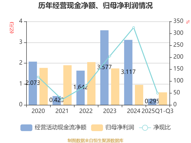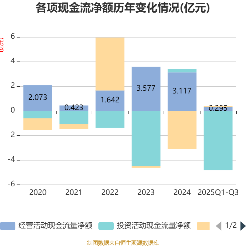 2025年前三季度,公司经营活动现金流净额为2946.08万元,同比增长59.53%;筹资活动现金流净额985.29万元,同比增加2.55亿元;投资活动现金流净额-4.84亿元,上年同期为2951.76万元。