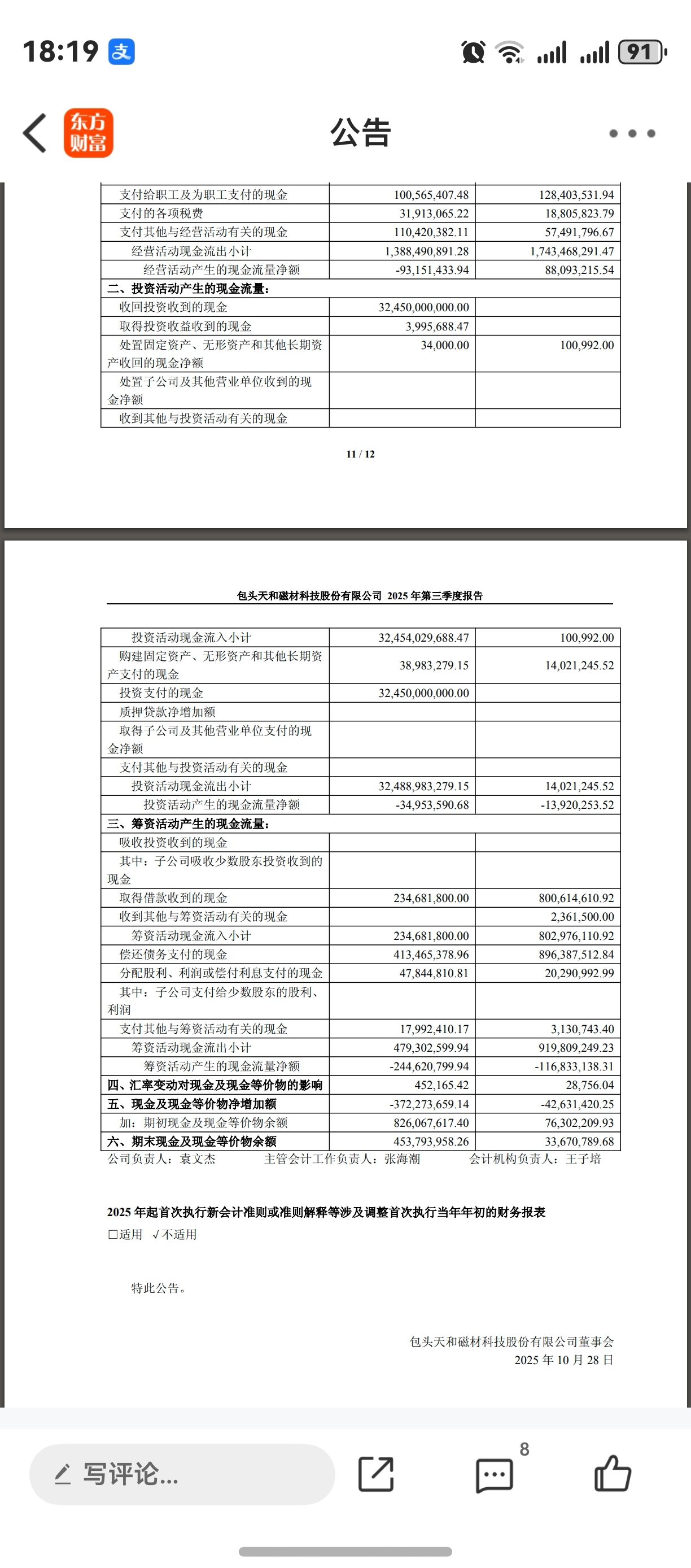 $天和磁材(SH603072)$ 友情提示,财报数据填报有误,收回投资流入与投资支付流出高达均为324.5亿?中报数据才26亿多,用脚想都是有问题的哈…$创业板指(SZ399006)$