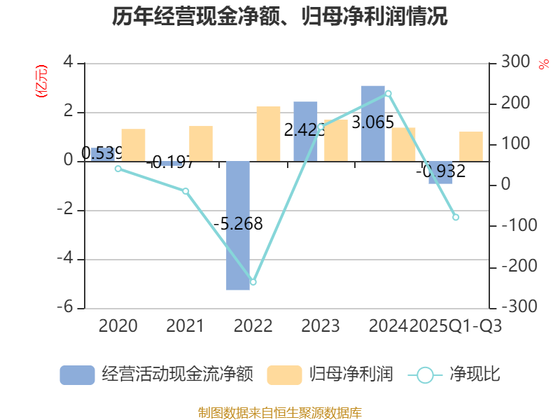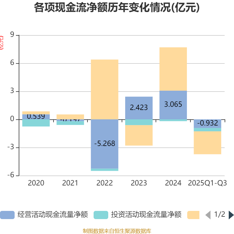 2025年前三季度,公司经营活动现金流净额为-9315.14万元,同比减少1.81亿元;筹资活动现金流净额-2.45亿元,同比减少1.28亿元;投资活动现金流净额-3495.36万元,上年同期为-1392.03万元。