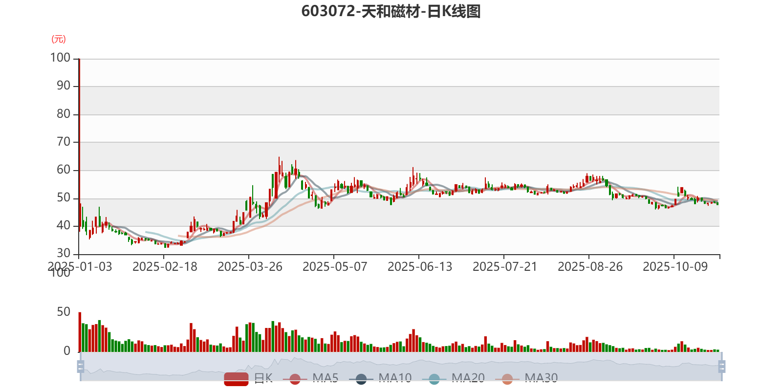 中证智能财讯天和磁材(603072)10月29日披露2025年第三季度报告。前三季度公司实现营业总收入16.1亿元,同比下降16.86%;归母净利润1.2亿元,同比增长12.46%;扣非净利润1亿元,同比下降4.46%;经营活动产生的现金流量净额为-9315.14万元,上年同期为8809.32万元;报告期内,天和磁材基本每股收益为0.45元,加权平均净资产收益率为5.74%。