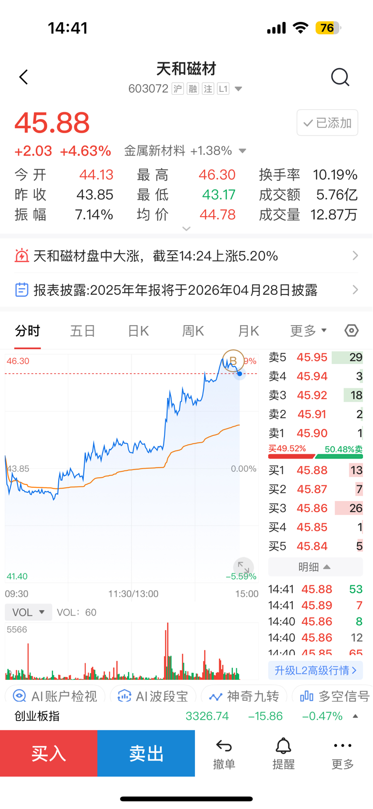 $天和磁材(SH603072)$ 合着监控着我手机的几千块是吧,46.1,买进来直接就下去了?