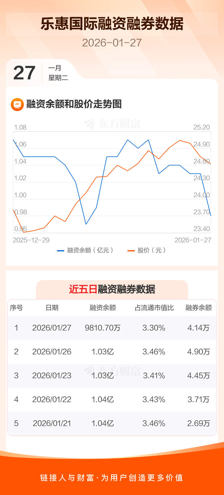 交易所最新数据显示,乐惠国际于2026年1月27日获融资买入481.28万元,融资偿还1000.42万元,当日融资净偿还519.14万元。目前,该股融资余额9810.70万,占流通市值比例为3.30%。