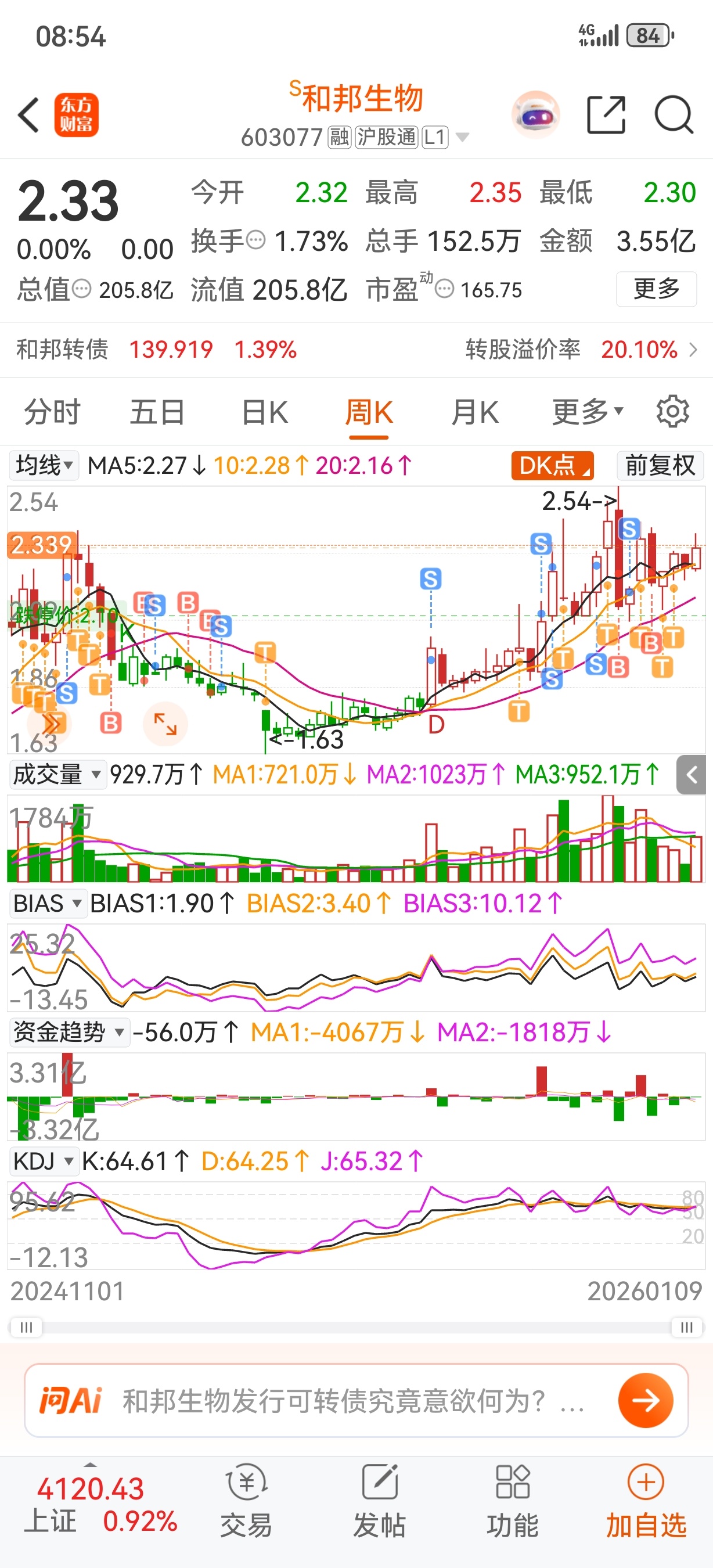 $和邦生物(SH603077)$ 已经忘记了第几次回本,坚持了1000多天,最近一直在成本线附近来回跳,慢慢熬吧,大盘已经突破10年新高,相信和邦也会起飞。