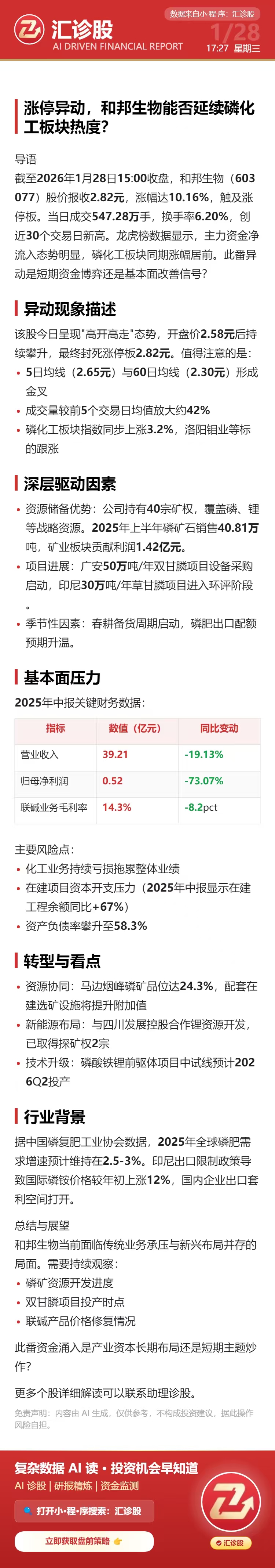 涨停异动,和邦生物能否延续磷化工板块热度?