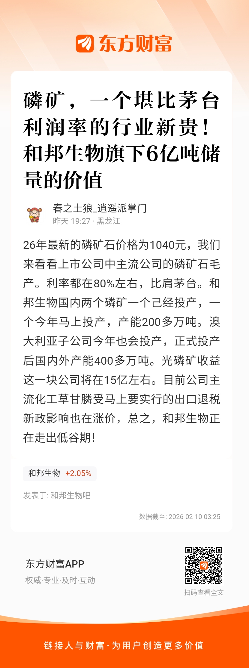 26年最新的磷矿石价格为1040元,我们来看看上市公司中主流公司的磷矿石毛产。利率都在80%左右,比肩茅台。和邦生物国内两个磷矿一个己经投产,一个今年马上投产,产能200多万吨。澳大利亚子公司今年也会投产,正式投产后国内外产能400多万吨。光磷矿收益这一块公司将在15亿左右。目前公司主流化工草甘膦受马上要实行的出口退税新政影响也在涨价,总之,和邦生物正在走出低谷期!