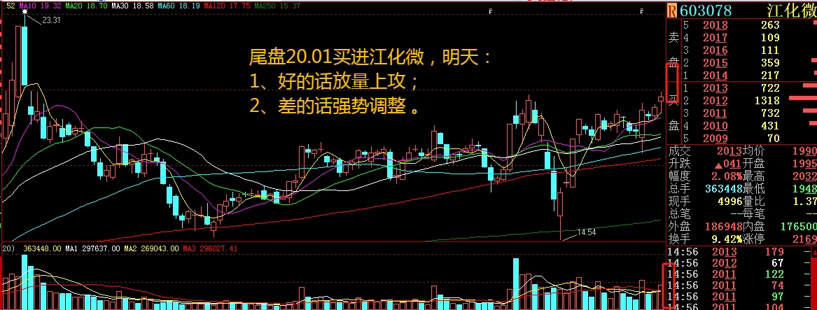 尾盘20.01买入江化微,希望明天主力选择放量上攻!