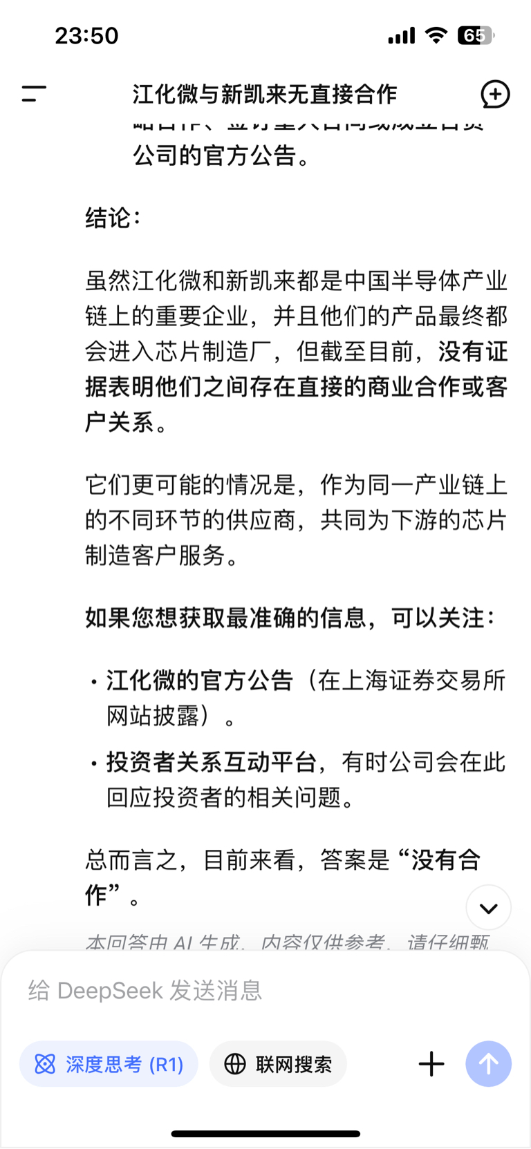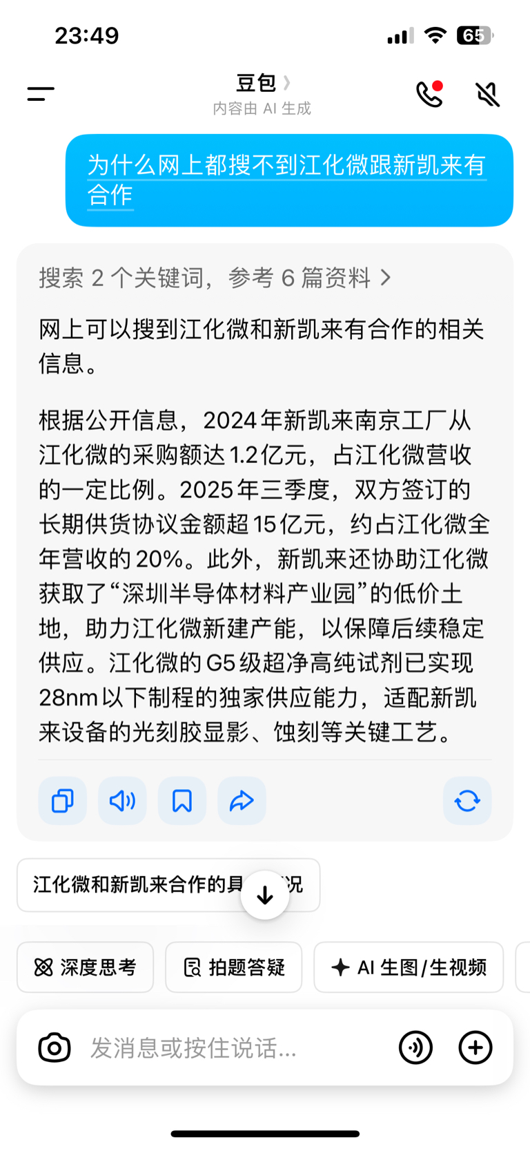 $江化微(SH603078)$ 看到有人发帖说江化微跟新凯来有合作,特地去试了一下,结果180度的分歧,豆包说有,DeepSeek说没有,而且百度上都没有,那么问题来了。这究竟是什么情况?