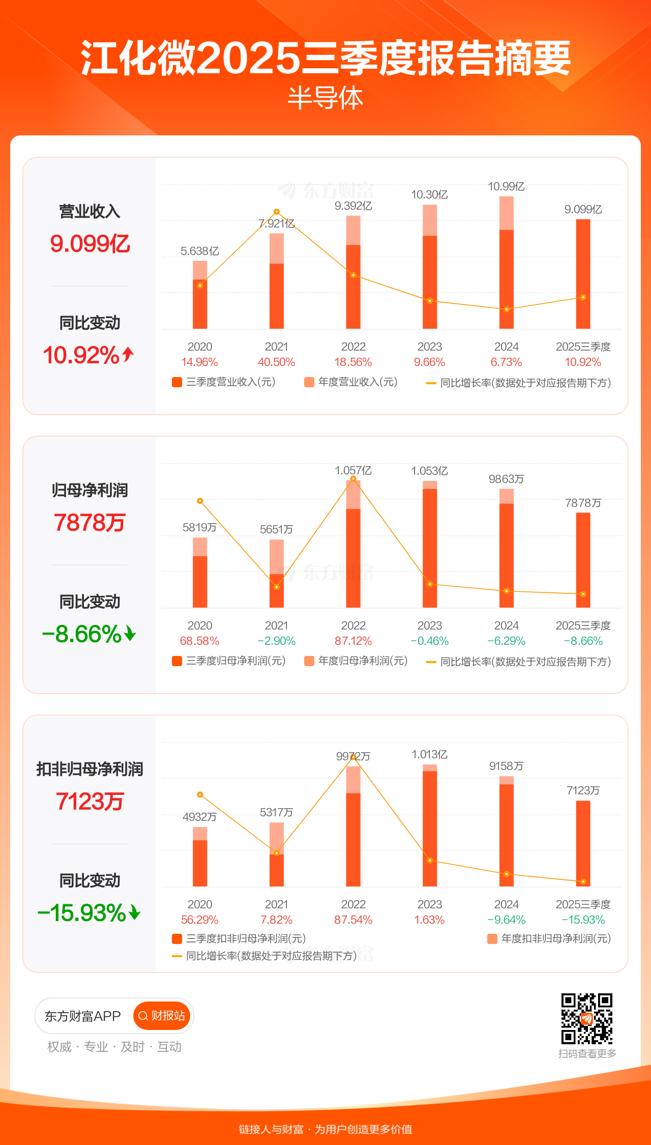 江化微10月25日发布2025年三季报显示,公司前三季实现营业收入9.10亿元,同比增长10.92%;归母净利润7878.30万元,同比下滑8.66%;扣非归母净利润7122.60万元,同比下滑15.93%。
