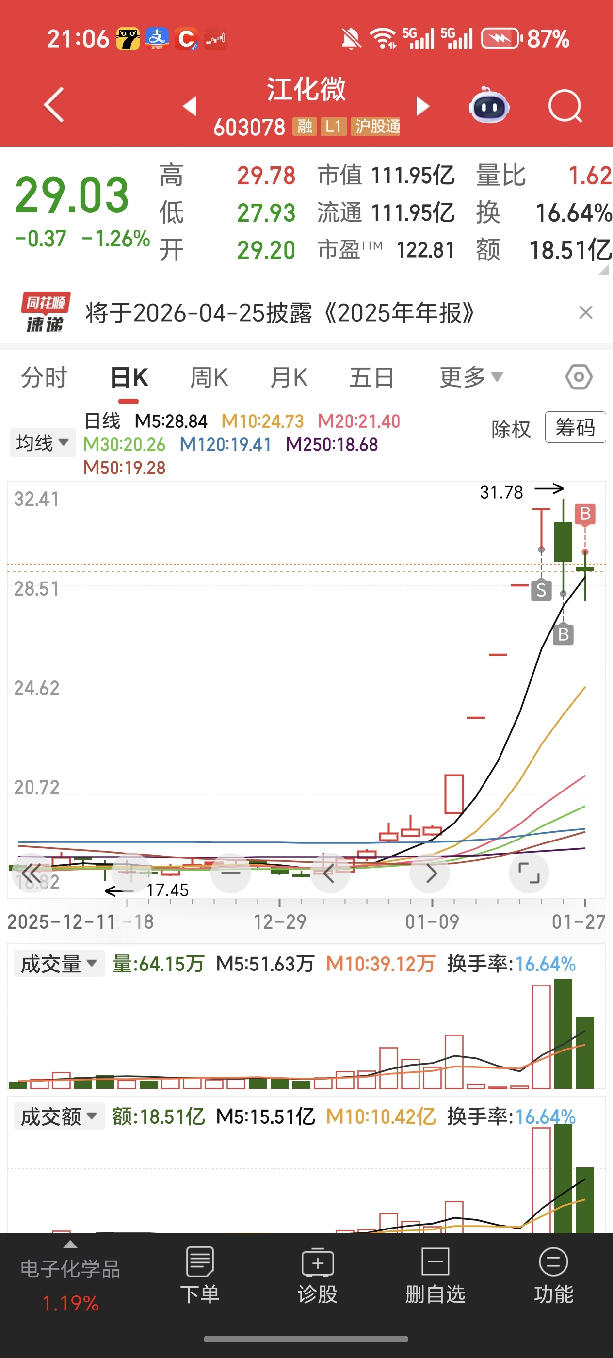 $江化微(SH603078)$ 我又杀回来了,预计3天之内,最多5天,必有一板。