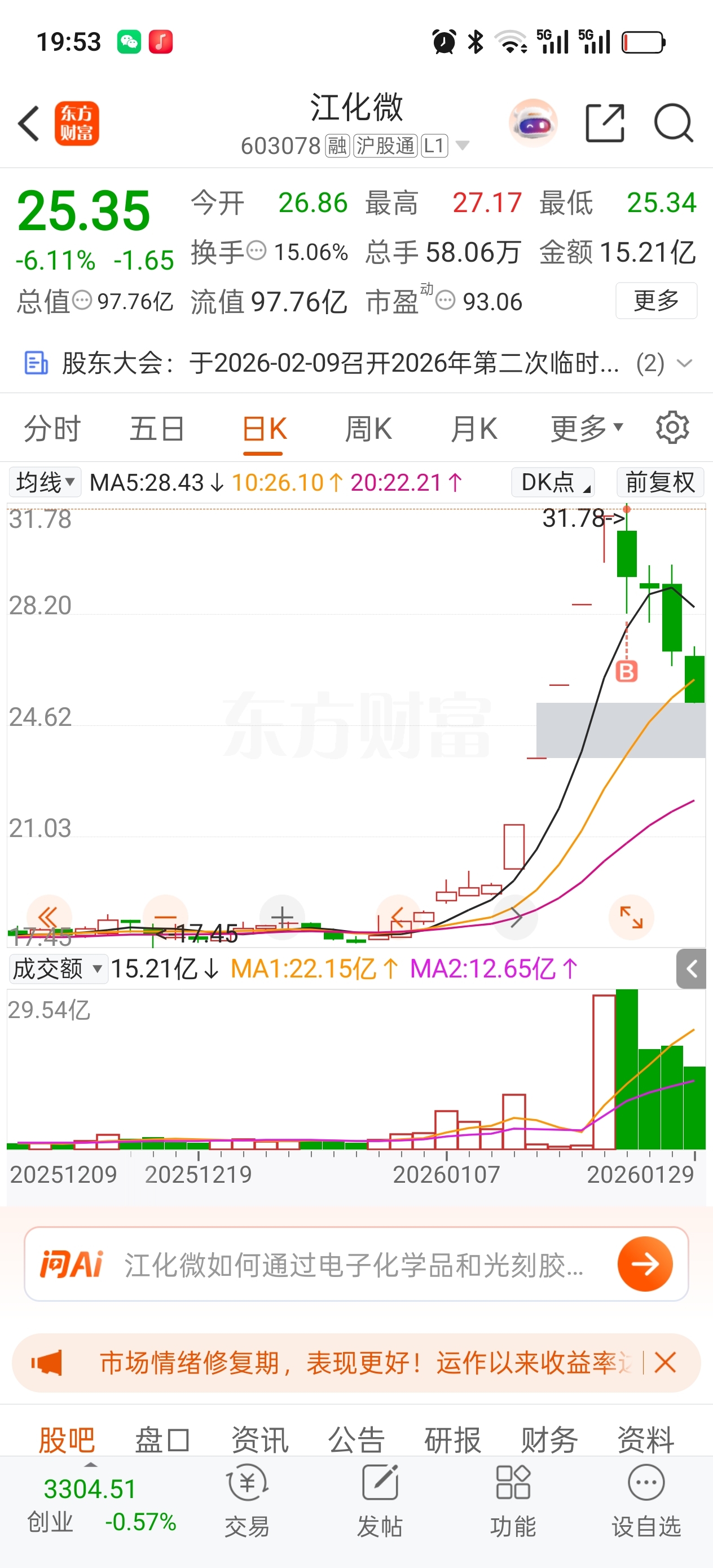 $江化微(SH603078)$ 感觉很对不起里面的大伙.我满仓,票是上一秒买的,他是下一秒跌的。然后一个星期没反弹一下。