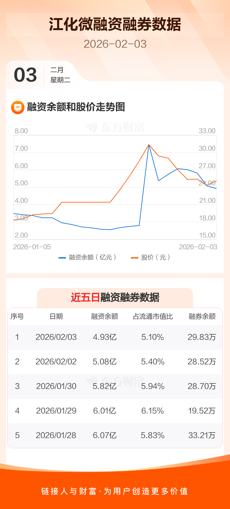 交易所最新数据显示,江化微于2026年2月3日获融资买入7369.04万元,融资偿还8869.91万元,当日融资净偿还1500.87万元。目前,该股融资余额4.93亿,占流通市值比例为5.10%。