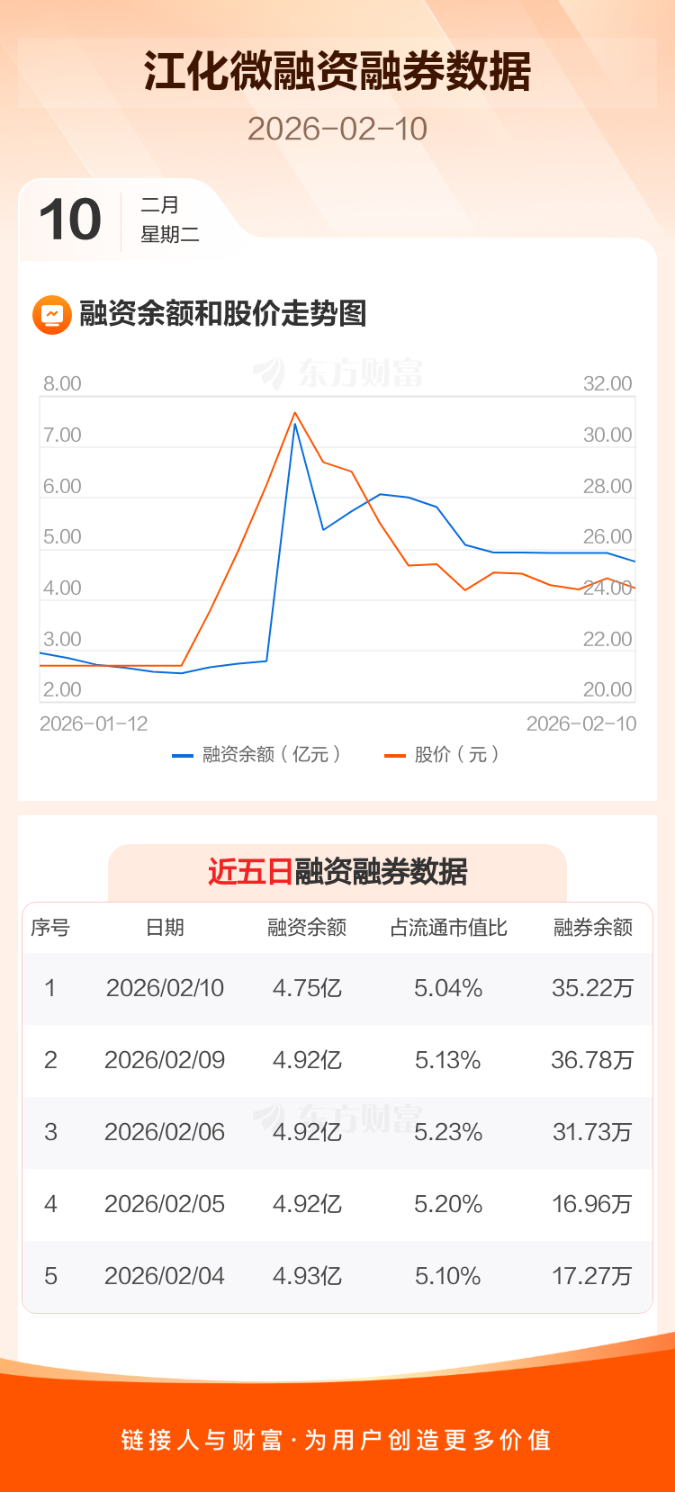 交易所最新数据显示,江化微于2026年2月10日获融资买入4729.12万元,融资偿还6395.05万元,当日融资净偿还1665.92万元。目前,该股融资余额4.75亿,占流通市值比例为5.04%。